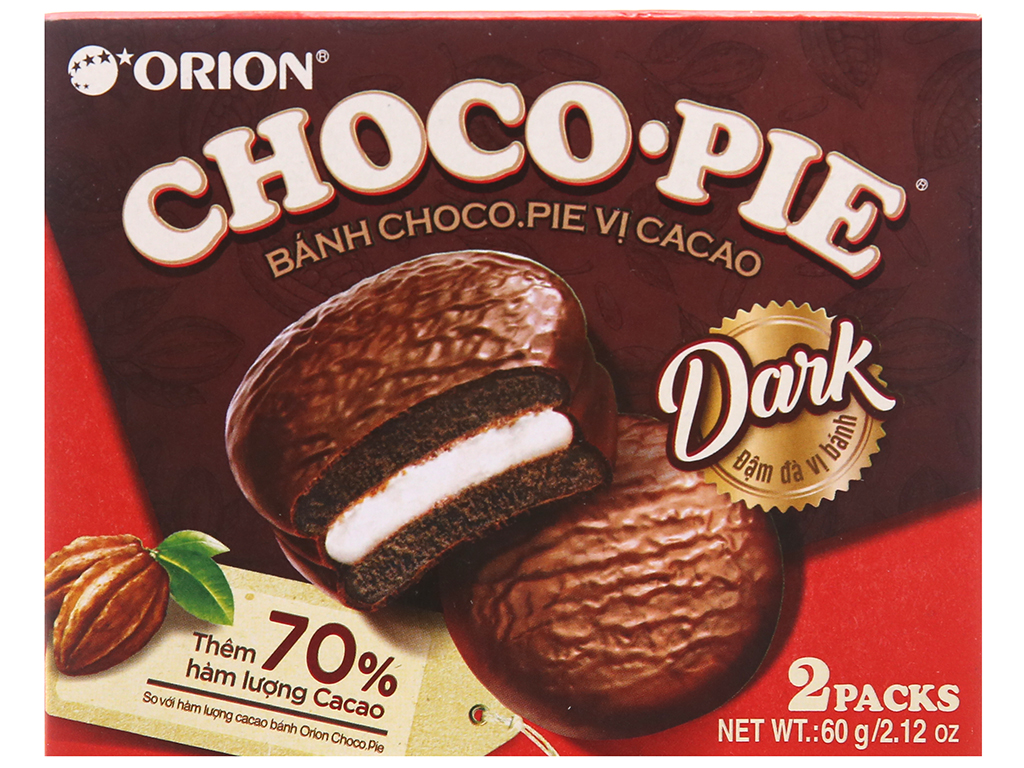 Bánh socola với lớp socola béo, thơm mà không bị đắng phủ bên ngoài lớp bánh xốp vị ca cao mịn rất ngon. Kẹp giữa của Bánh vị ca cao Choco-pie Dark hộp 60g (2 cái) là lớp kem marshmallow dẻo thơm. Bánh socola Choco-pie là thương hiệu từ Hàn Quốc