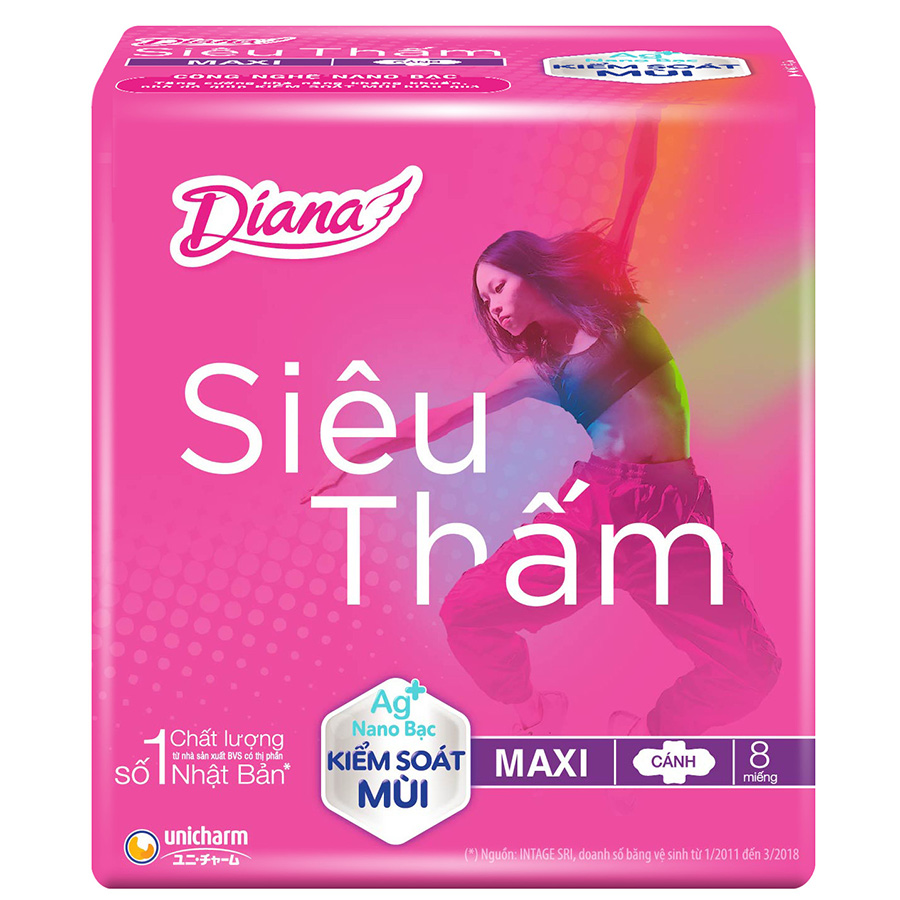 Băng vệ sinh Diana siêu thấm siêu mỏng cánh với mặt lưới siêu thấm Dry-Active chứa các hạt cao phân tử và có độ dày thích hợp giúp thấm hút nhiều hơn đồng thời ngăn thấm ngược trở lại, duy trì cảm giác khô thoáng suốt nhiều giờ.