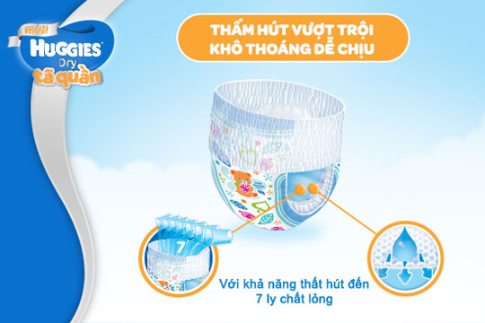 Là sản phẩm tã bỉm đến từ thương hiệu chăm sóc bé hàng đầu thế giới Huggies, tã bỉm Huggies mang tới độ thấm hút cực tốt, giữ cho bé luôn khô thoáng dài lâu, các bà mẹ ưa chuộng. Tã quần Huggies Dry size XXL 38 miếng (cho bé 15 – 25kg) lưng thun đệm mây, vừa vặn và êm ái cho bé