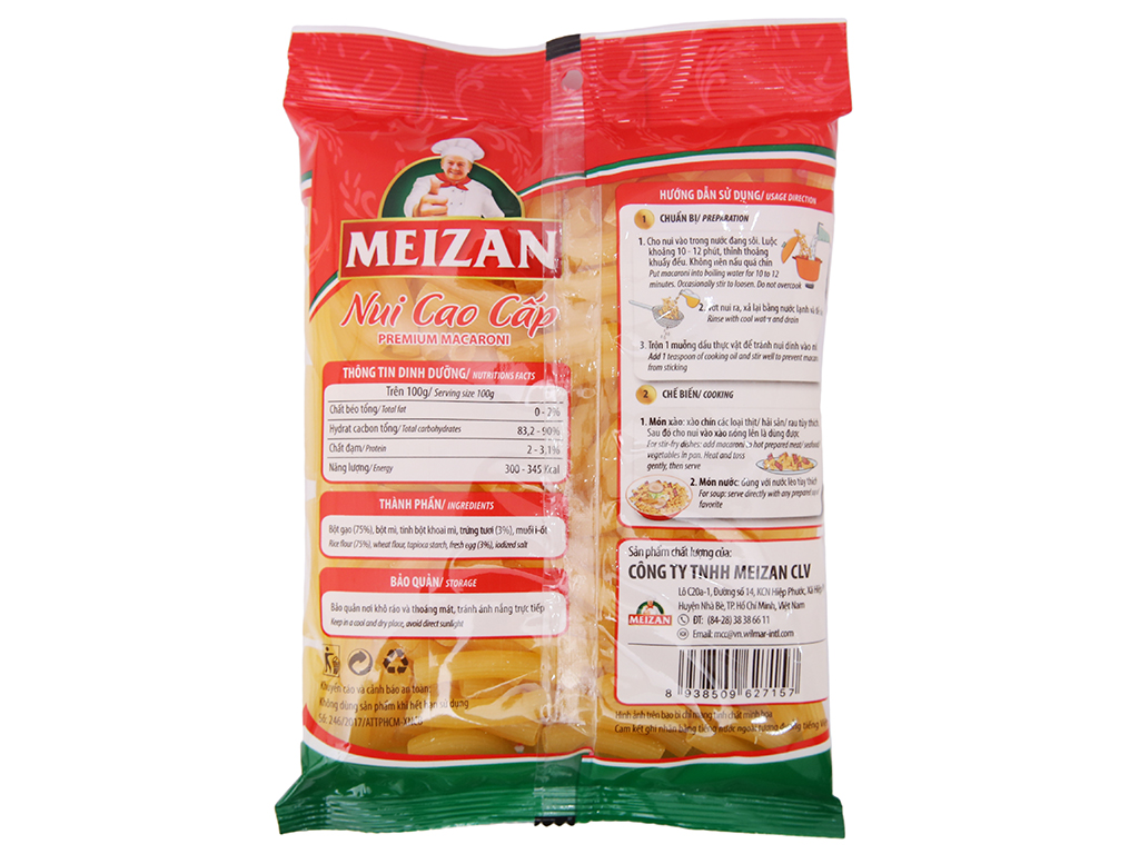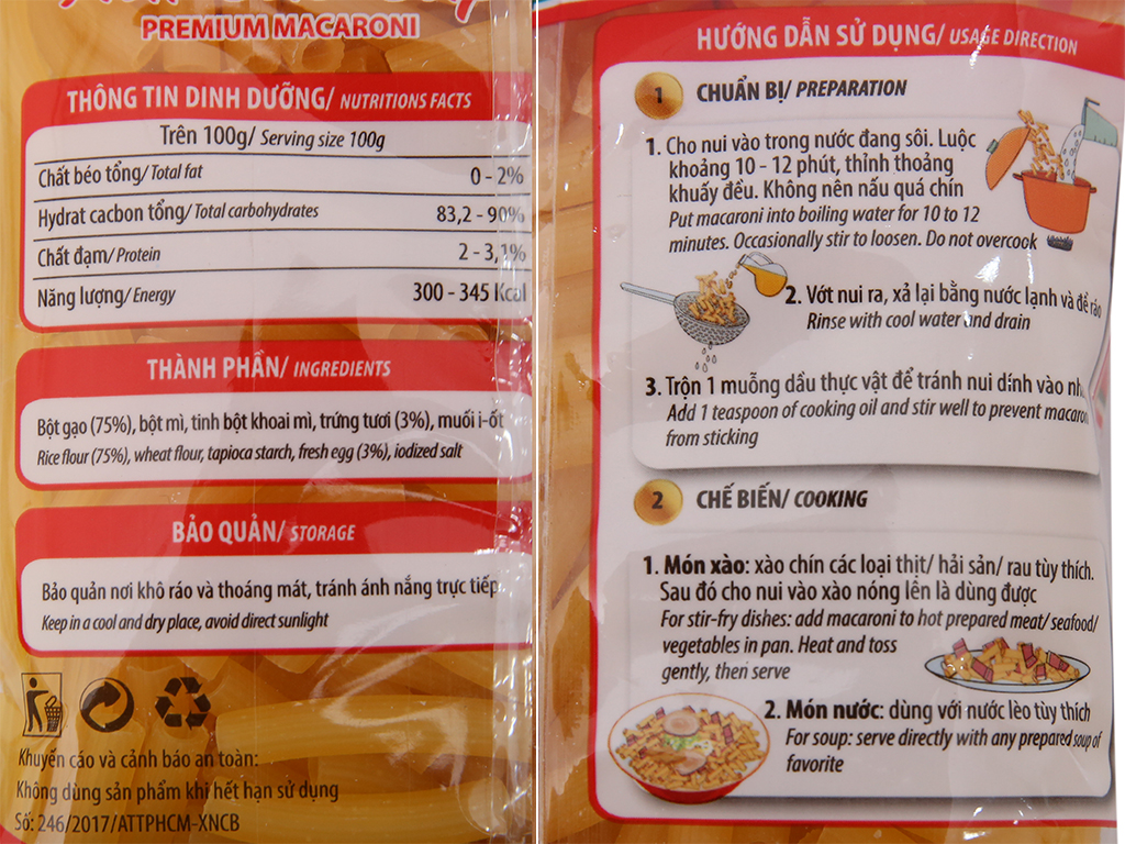 Bột gạo (75%), bột mì, tinh bột khoai mì, trứng tươi (3%), muối i-ốt